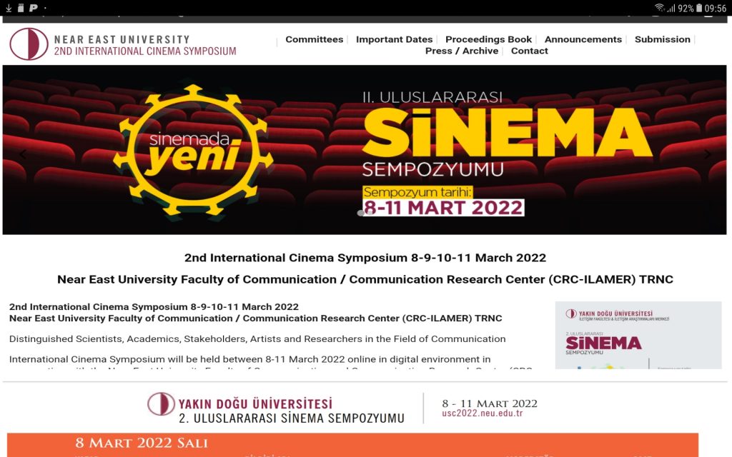 2nd International Cinema Symposium 8-9-10-11. Martie 2022 Universitatea din Orientul Apropiat Facultatea de Comunicare / Centrul de Cercetare în Comunicare (CRC-ILAMER) TRNC