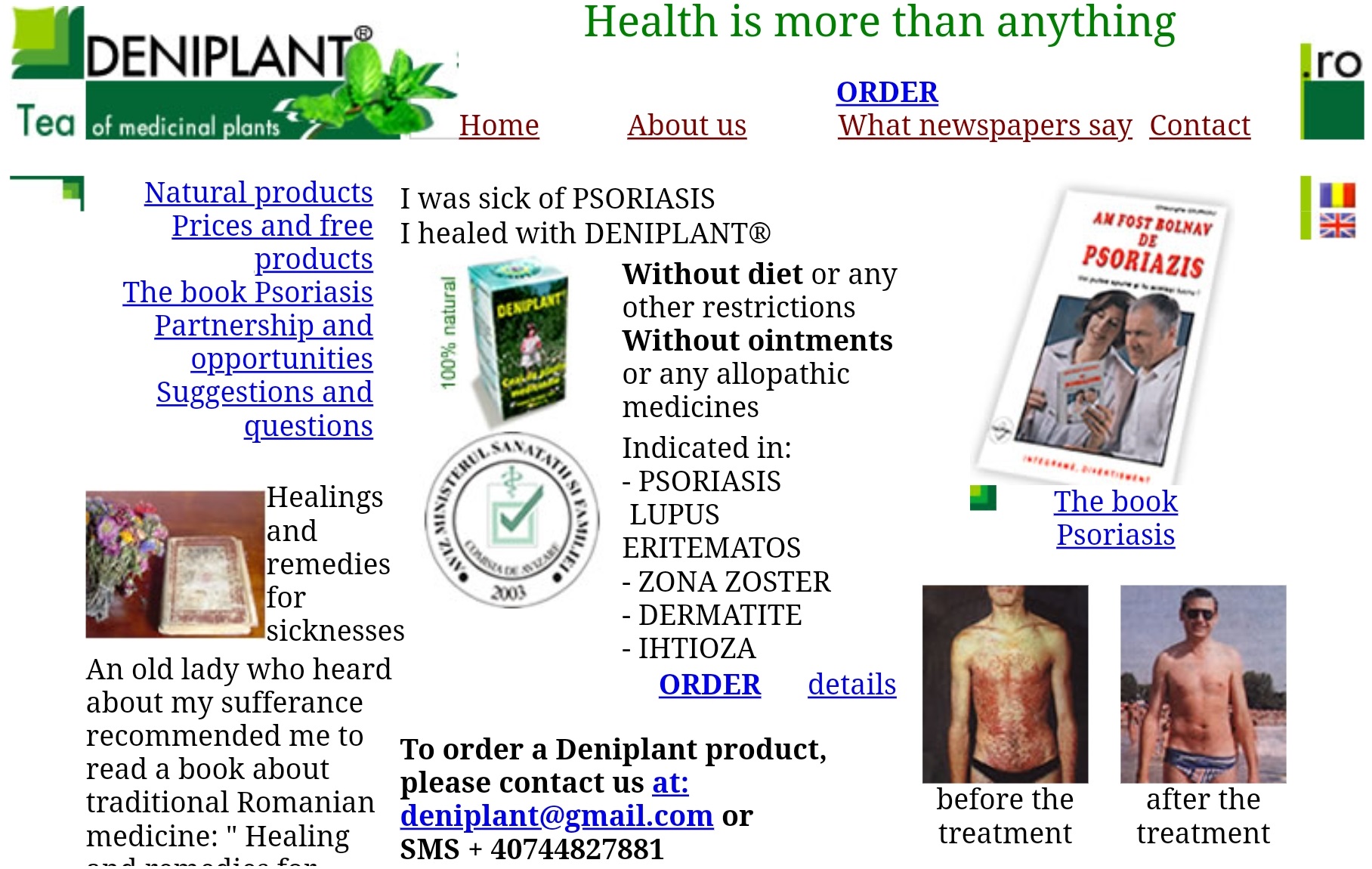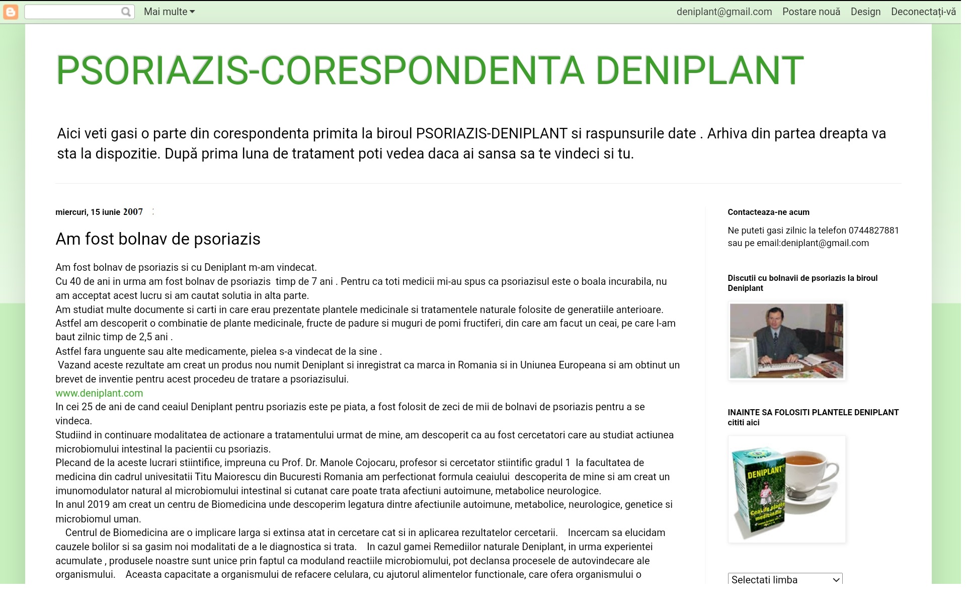Cronologie Deniplant Fiind bolnav de psoriazis de mai bine de 7 ani de zile, Gheorghe Giurgiu incepe cautarea unui remediu naturist pentru aceasta boala. Dupa doi ani si jumatate de cautari si teste pe propriul organism plantele medicinale s-au dovedit a fi singurul remediu eficace impotriva cauzelor interne care declanseaza si intretin aceasta boala.